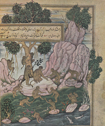Dans cette œuvre, la palette de couleurs vives, l’intégration du texte dans l’image, le contour des silhouettes, le paysage fantastique fourmillant de détails, seraient autant de signes de l’influence persane. La touche indienne se verrait dans le choix des espèces reproduites (figuiers des banians, manguiers ou palmiers) qu’on ne trouve pas en Iran, et dans les attitudes libres données aux animaux [4].