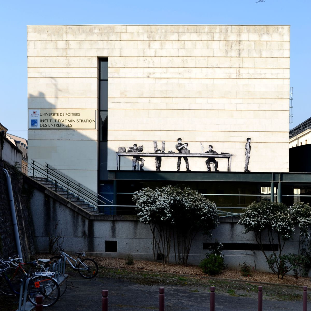 A l’occasion de sa semaine « ressources humaines » (18-20 mars 2014) consacrée au bien-être au travail, l’Ecole Universitaire de Management de Poitiers a demandé à Levalet, artiste dessinateur de rue, de décorer ses murs. Ainsi est né l’AUTOPRODUIT :