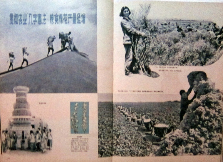 Les textes sont écrits en chinois et donc pour moi impénétrables. Reste néanmoins le montage et le choix des images qui forment des idéogrammes universels. Ils montrent que le travail réformateur pouvait être aussi bien industriel qu’agricole. En haut à gauche, la coopération entre deux ouvriers, l’un accroupit, l’autre debout, produit, à l’intersection des barres qu’ils tiennent en main, un foyer d’étincelles. A droite, un ouvrier intervient sur une pièce mécanique placée sur un tour, pendant que deux autres semblent le regarder agir. Peut-être un maître d’apprentissage transmettant son savoir ? En bas à gauche, sur fond d’une usine en activité, un groupe d’hommes est assis par terre pendant qu’un autre, debout, semble leur enseigner quelque chose : les préceptes marxistes et maoïstes ? En bas à droite, des hommes curieusement disséminés au milieu d’un champ de blé, moissonnent à la faucille. Mais c’est la photographie détourée qui semble donner la morale de l’histoire. Un jeune moissonneur souriant, tête levée, s’essuie le cou tout en tenant de l’autre bras, une gerbe et une faucille : une manière de signifier que le travail est un effort dont on sort avec le contentement de l’ouvrage accompli.