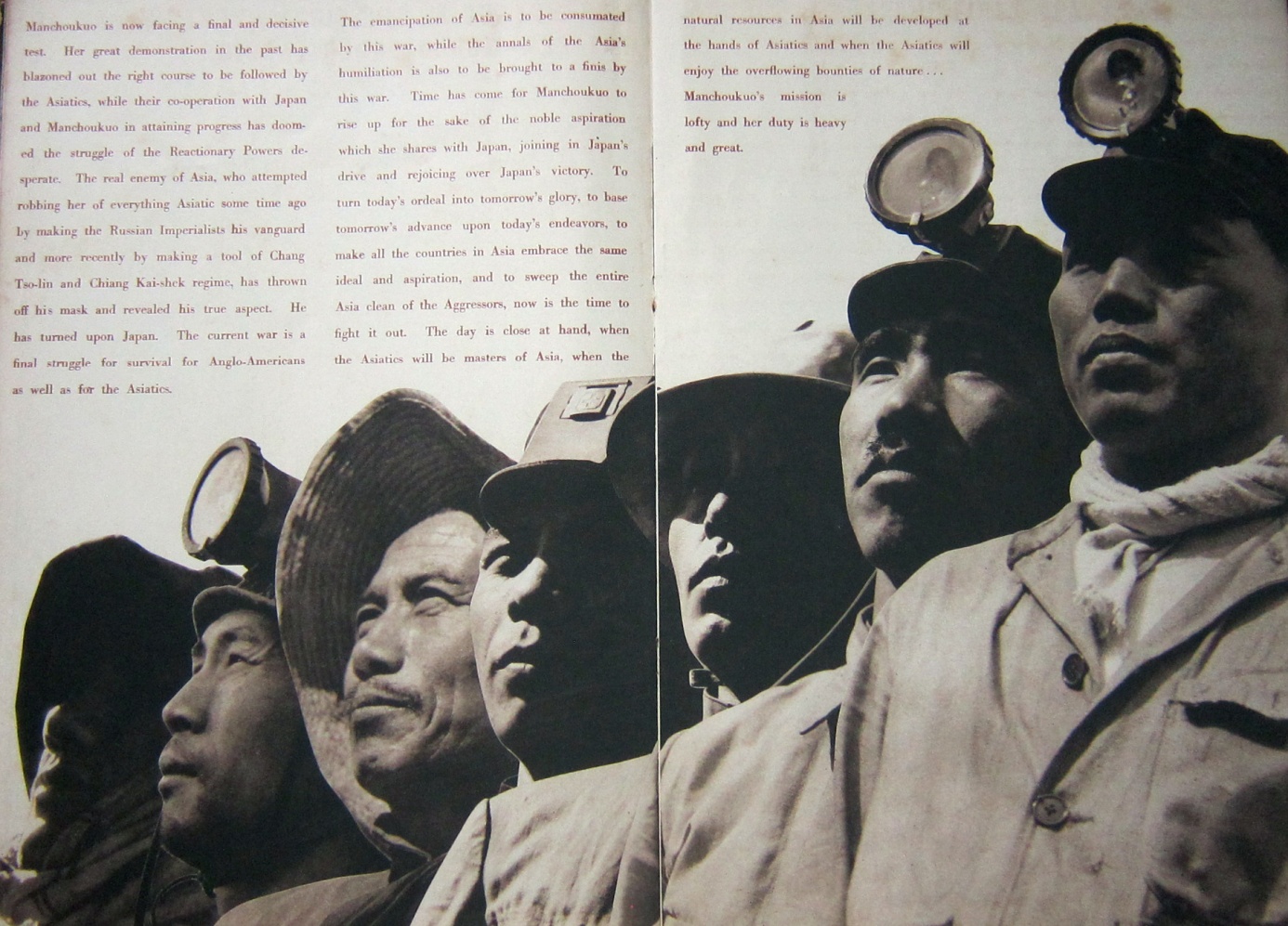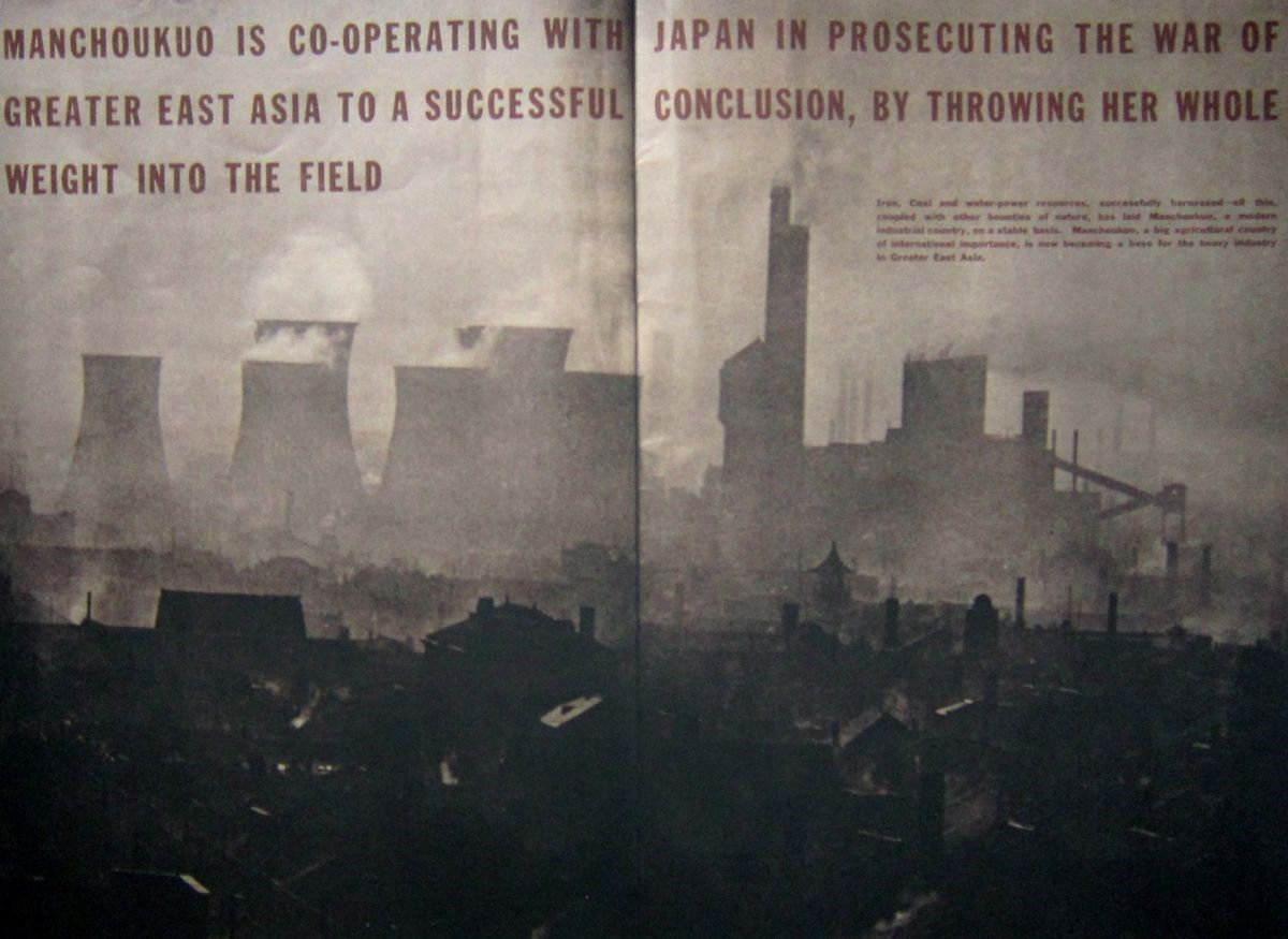 La rhétorique ici est subtile ; le texte s’appuie sur une image qui ne l’illustre pas. 0n parle en effet d’une guerre qu’on va gagner mais qu’on ne voit pas. Ni char, ni bataille, ni encore moins de morts, mais un nouveau monde qui se profile à l’horizon – des usines qui tournent à plein régime – et surplombe l’ancien. La coopération du Japon et du Mandchoukouo dans la guerre, c’est la grande Asie qui se lève, une économie puissante qui dame le pion à l’occident et s’en libère. Le texte sur la page de droite, plus petit, est plus explicite : « la Mandchourie, un grand pays agricole d’importance internationale, devient maintenant une base de l’industrie lourde dans une plus Grande Asie de l’Est ».