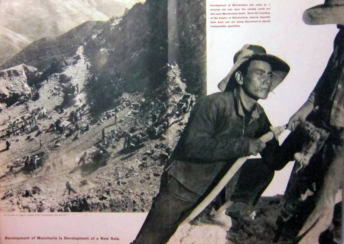 Voilà la bonne nouvelle annoncée sur ce montage : « Le développement du Manchoukouo a été une surprise non seulement pour le monde extérieur mais aussi pour le Mandchoukouo lui-même. Depuis la fondation de l’Empire du Mandchoukouo, des gisements miniers sont en train d’être découverts dans des quantités presque inépuisables ». Le photographe ici pour rendre encore plus explicite son image trop muette, n’hésite pas à renchérir dans la métaphore. Avec lui, le travail du mineur à ciel ouvert devient bucolique : il tient une fleur entre ses lèvres !