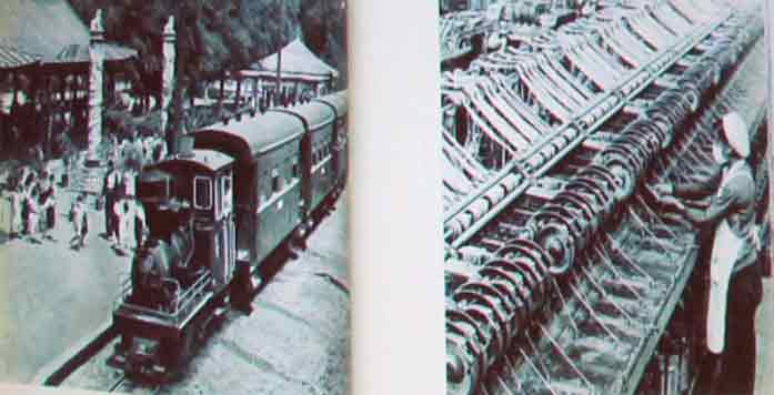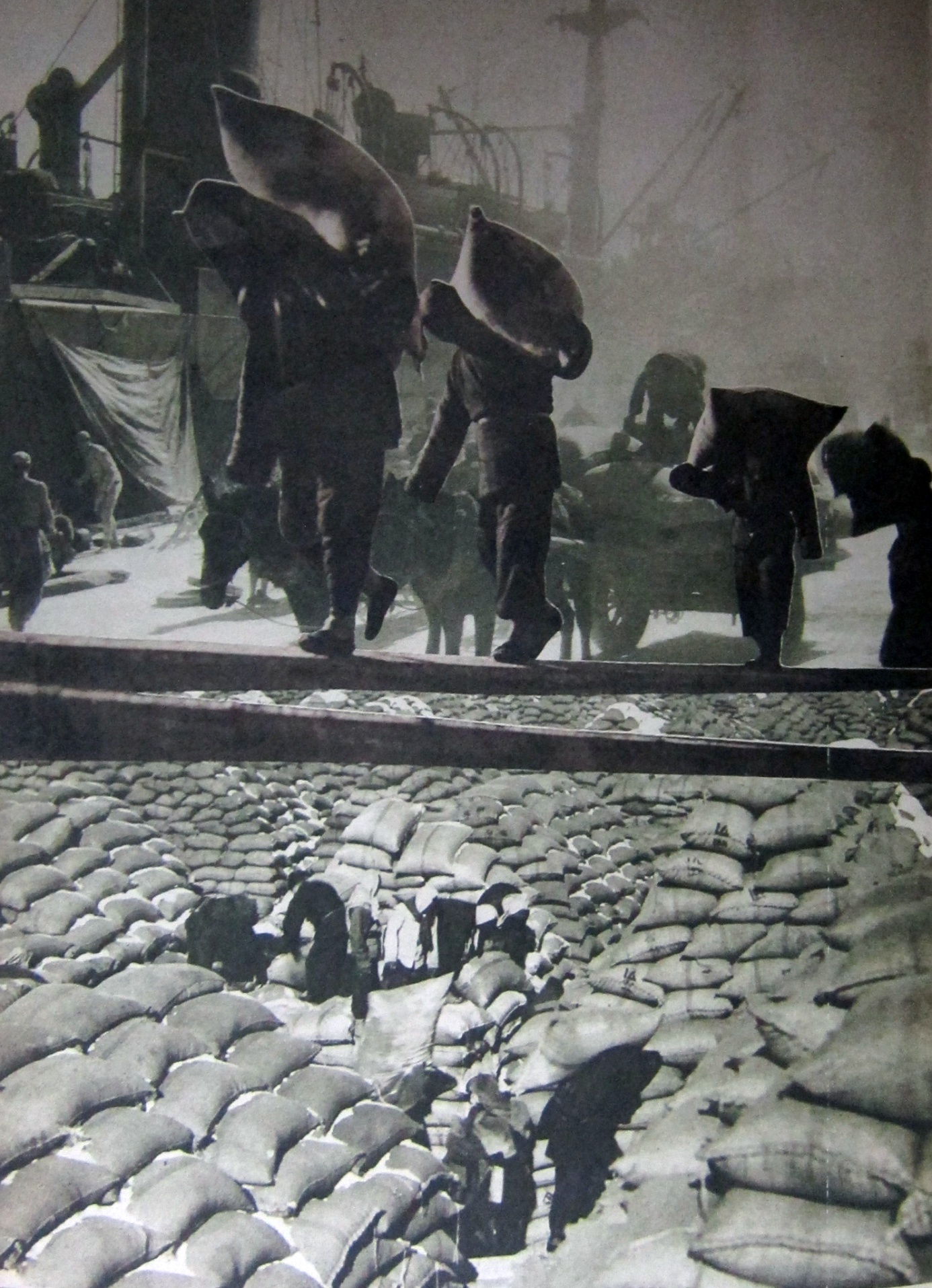 Superbe montage ici de trois photographies superposées. En bas, une montagne de sacs stockés dans un entrepôt, avec une équipe de manœuvres en son centre qui les prélèvent. En haut, c’est un bateau à quai que l’on voit, à moitié caché toutefois par une file de porteurs qui montent leur fardeau en escaladant une poutre qui mène au navire. En une seule image, une histoire sans parole nous est racontée : la profusion règne au Mandchoukouo dont les plaines fertiles permettent de répondre à « l’augmentation de la demande venant de différentes parties du monde pour le précieux soja. ».