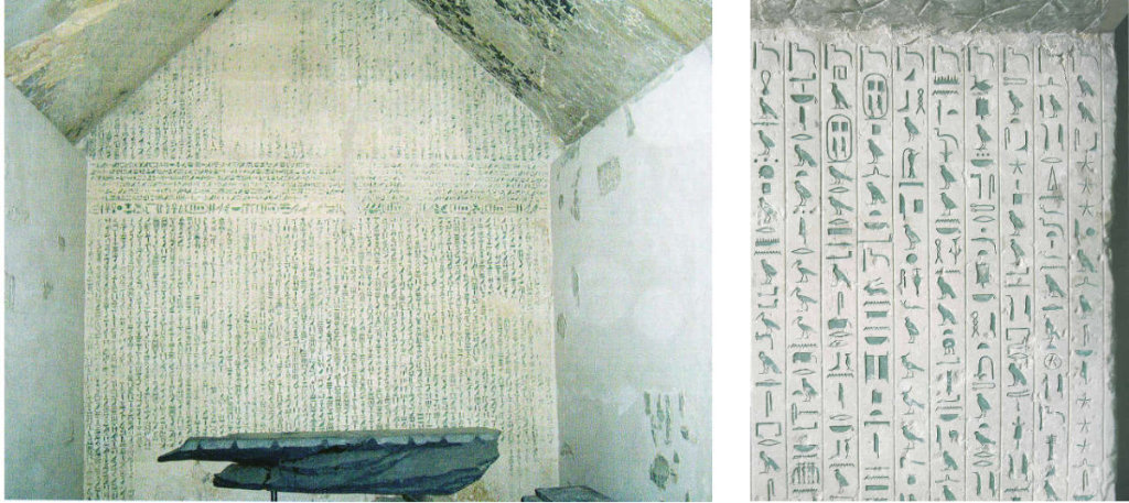 [8] Ces écrits sont les premiers d’une longue série que l’on retrouvera, au Moyen empire, inscrit sur les sarcophages et que les Égyptologues désigneront comme Texte des sarcophages, puis, au Nouvel empire, sur des Papyrus qu’ils baptisèrent le Livre des morts.