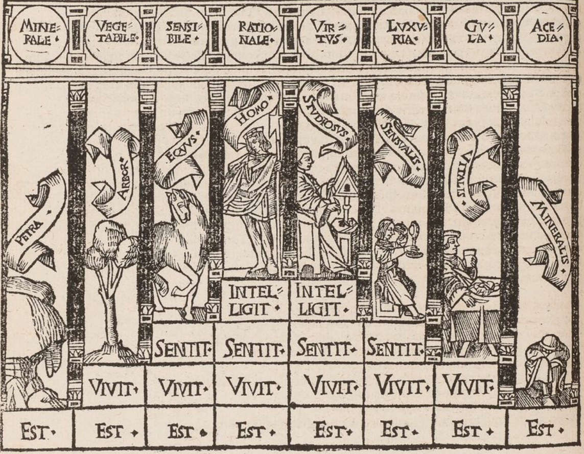 Les quatre premières colonnes hiérarchisent les êtres selon leur nature sur 4 niveaux. Le premier, les existants ou étants (EST), est commun à tous, mais le monde minéral symbolisé par un rocher, n’accède qu’à ce degré. Le second, ce sont les vivants (VIVIT) qui est la limite supérieure du monde végétal, symbolisé par un arbre. Il n’accède en effet pas à la perception par les sens (SENTIT) réservée au monde animal, symbolisé par un cheval, et à l’espèce humaine. Mais seule cette dernière est dotée de la raison (INTELLIGIT).  Cette hiérarchie des êtres qui peuplent le monde n’a rien d’innovant. On la trouve déjà présente dans l’Isagoge du néoplatonicien Porphyre, un ouvrage philosophique de référence pour les étudiants au moyen-âge. Plus intéressantes sont les quatre dernières colonnes qui ne concerne que l’homme et portent un jugement moral sur ce qu’il fait de lui-même. La première d’entre elles porte le nom de « vertu » (VIRTUS). Cette vertu, c’est « la sagesse (seule) susceptible de mettre l’homme sur ses pieds, de le maintenir et le fixer dans son humanité ou, si l’on veut,  de lui interdire de sortir des bornes humaines en partageant le destin des êtres inférieurs » [17]. Les trois autres sont des péchés capitaux : la luxure (LUXURIA), la gourmandise (GULA) et l’acédie (ACEDIA). Celui qui s’adonne à la luxure et à la consommation sexuelle est semblable aux bêtes, car ce qui prévaut en lui, c’est la lubricité et la reproduction de l’espèce. La gourmandise rend l’homme semblable aux végétaux, car dominé par elle, il n’exerce qu’une fonction de nutrition, sans sensation ni plaisir. L’acédie, c’est se tenir « immobile à la façon d’un caillou » [18].  L’acédie est d’habitude traduit par « paresse », mais cette traduction ne rend pas bien compte de ce « phénomène monstrueux » [19] et de sa complexité. L’acédie, c’est ne pas vouloir quelque chose, plutôt que rechercher quelque chose. C’est une négativité qui peut être neutre (une absence de volonté) ou plus forte (refuser, rejeter, fuir), le balancement entre ces deux pôles traversant tout le moyen-âge [20]. Pour Charles de Bovelles, « ces gens se montrent plus que quiconque ingrats envers les dons de la nature » [21]. Aussi place t’il un homme replié sur lui même à la hauteur du rocher de la première colonne.