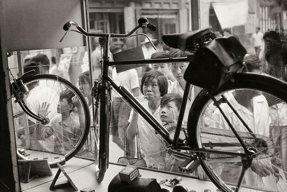 Voici une œuvre tout en profondeur, au sens propre comme au figuré. Son cadre magique multiplie les cadres. L’œil est d’abord attiré par le triangle central et les regards des personnages, gros de désirs. Une deuxième fenêtre à gauche éclaire en miroir la scène. Le jeune garçon pose sa main auréolée sur la vitrine, légèrement au-dessus du moyeu de la roue, comme pour se saisir symboliquement de la bicyclette. Bien que celle-ci et ses contemplateurs s’interposent, la rue est suffisamment visible pour que l’on comprenne qu’elle n’est arpentée que par des piétons. Ni vélocipède, ni encore moins d’automobile ne l’encombrent. Nous sommes à Pékin en 1958, pas à New-York.