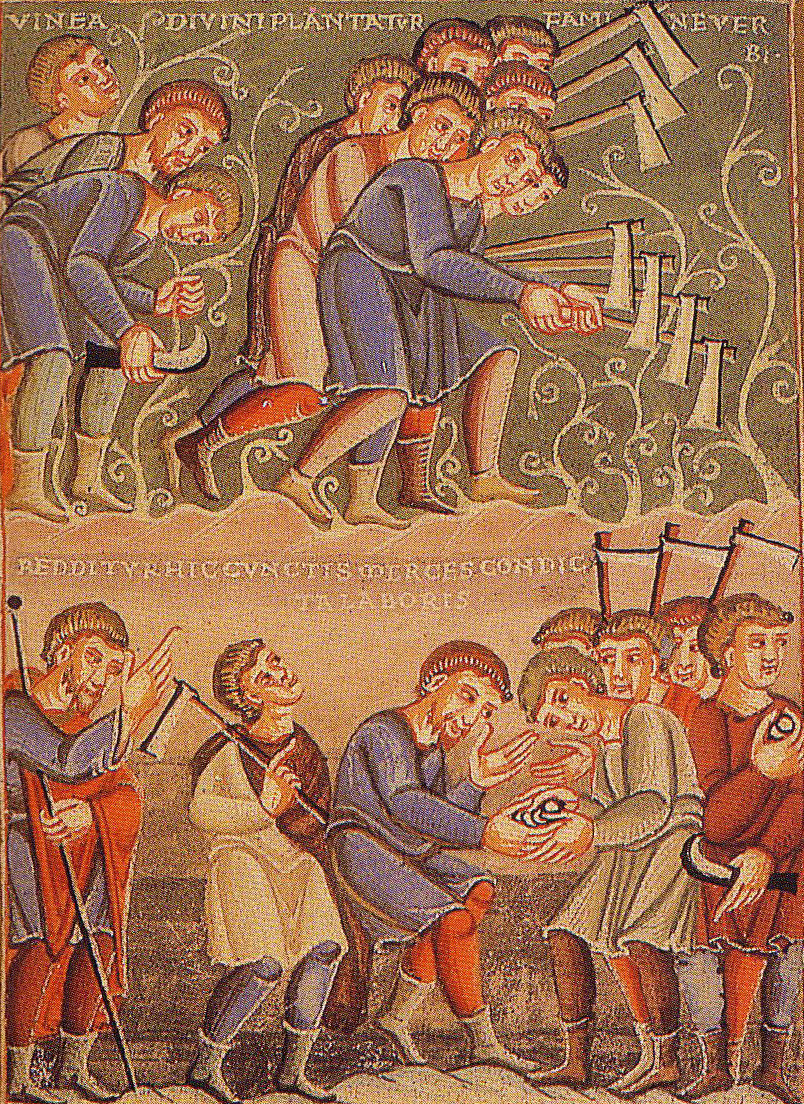 Cette magnifique illustration, pleine de vie, introduit la parabole de l’ouvrier de la 11° heure (Matthieu, 20) dans le lectionnaire d’Henri III, empereur du Saint-Empire Romain Germanique. Elle peut toutefois se lire indépendamment d’elle, comme une allégorie laïque du travail et de sa rémunération. Elle se présente comme une bande dessinée constituée de deux tableaux successifs reliés organiquement l’un à l’autre :