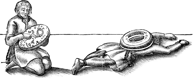 Sur cette peau était dessinée, avec une encre rouge très stable dans le temps, un grand nombre de figures représentant chacune une entité particulière du monde visible et invisible : des dieux, des lieux, des animaux, des hommes, leurs activités, des objets… Un marteau en forme de T, en os de renne, servait à battre le tambour et faire circuler à sa surface un anneau, l’arpa (« sort » en Sami). Les mouvements de celui-ci traçaient un chemin allant d’une figure à une autre qui permettait au noaidi de formuler la réponse à la question qui lui était soumise. En absorbant, semble t’il, des champignons hallucinogènes, il pouvait également entrer en transe comme le montre l’illustration ci-dessous [2], afin de se mouvoir dans le monde des esprits et entendre ce qu’ils avaient à lui dire.