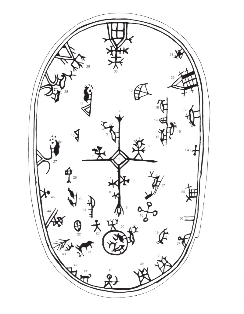 On recense deux types différents de tambours Samis : les tambours du sud dont la surface est divisée par des traits horizontaux qui distinguent ainsi différentes régions de l’univers et les tambours du nord, les plus nombreux, dont la surface est indivise. A partir d’un tambour conservé en Allemagne appartenant à ce dernier type, celui de Foldalen [4], on peut en quelque sorte rendre visite au paysage mental Sami.
