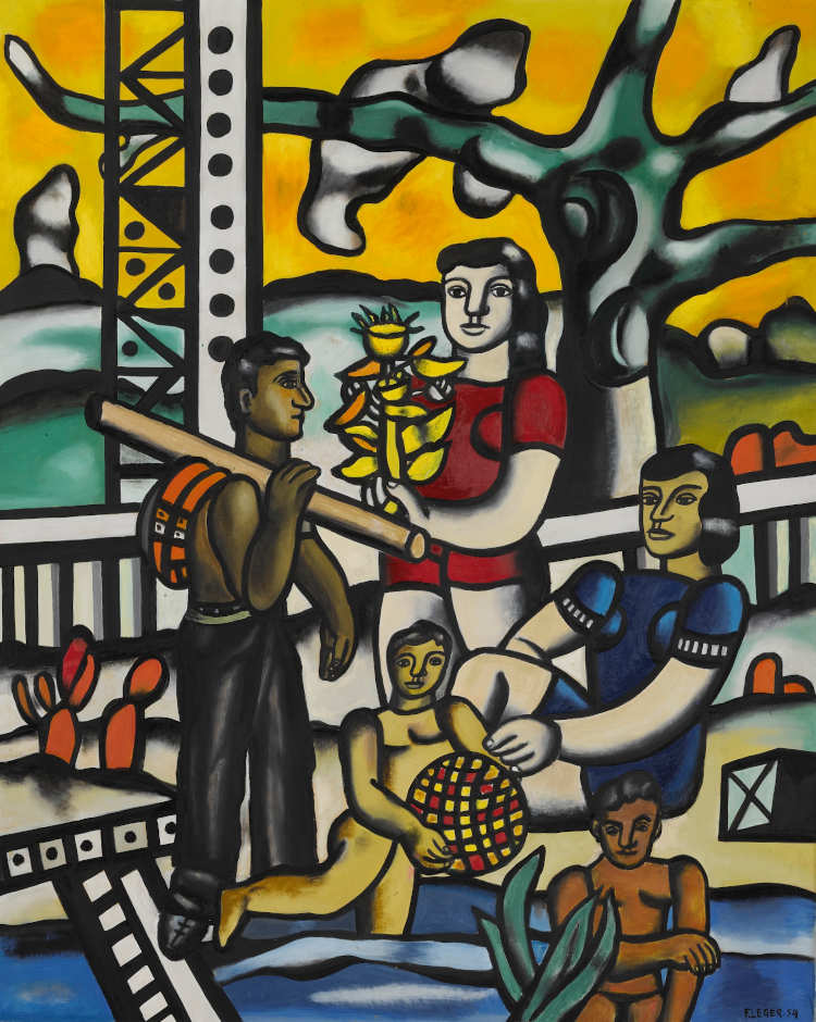 [3] Né à Argenton en 1881, proche des cubistes au début de sa carrière, Fernand Léger est profondément marqué par la Première Guerre Mondiale, épreuve qui le rapproche des “gens du peuple“ et qui lui fait reconsidérer ses options artistiques pour s’orienter vers un art plus réaliste. Engagé politiquement, notamment à l’occasion du Front Populaire, il adhère en 1945 au Parti Communiste après un exil aux États- Unis durant la Seconde Guerre Mondiale. Dans l’après-guerre, il peint une série d’œuvres monumentales consacrées au travail et au loisir. Il meurt à Gif-sur-Yvette en 1955.