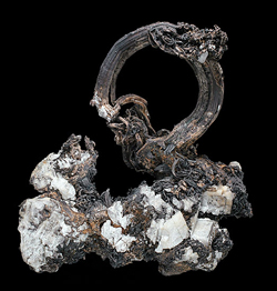 Un minéral est dit natif lorsqu’il est composé d’un seul élément chimique, sans combinaison avec d’autres. Celui-ci est issu d’une mine d’argent norvégienne. Il a été offert à Louis XV par le roi du Danemark. C’est une pièce unique car de tous les argents natifs issus de cette mine, c’est la seule sur laquelle les filaments d’argent forment une boucle intégrale. C’est donc sa beauté et son originalité qui l’ont sauvé du grand mélange dans les fonderies d’argent et l’ont fait passer de l’état de matière première potentielle à celui de produit fini, digne d’être un cadeau royal.