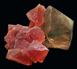 Découverte en 2006 dans le massif du Mont Blanc, cette pierre allie une fluorite rouge, très rare, à un quartz enfumé. C’est un témoin de l’histoire géologique des Alpes : lors de la formation du massif, des eaux circulaient dans des fentes et puisaient dans la roche environnante des éléments minéraux (de la silice, du calcium, du fluor…). Ceux-ci ont ensuite cristallisé dans des espaces souterrains constituant des espèces de fours et ils ont donné, sous de hautes températures (400°C), le quartz puis le fluorure de calcium, sous forme octaédrique. La radioactivité du granite environnant est venue activer la couleur liée à ces éléments, colorant en rouge la fluorite et enfumant légèrement le quartz. Avec la surrection des Alpes, les cristaux sont remontés dans leur four et n’attendaient plus que l’érosion ou un cristallier pour apparaître… D’un point de vue anthropomorphique, on peut donc dire que la terre est une sorte d’industrie autogérée qui nous met à disposition ses productions pour peu que nous fassions l’effort de les chercher.
