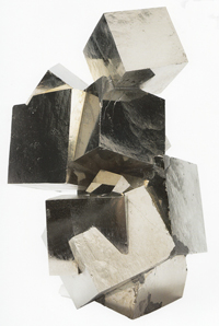 La plupart des minéraux ont une forme cristalline, c'est à dire une structure régulière et périodique d’atomes. Ici, ils forment des cubes enchâssés les uns dans les autres, se tenant en un équilibre audacieux. La pyrite est surnommée l’« or des fous » car elle a une couleur dorée qui l’a souvent fait prendre pour de l’or par des chercheurs amateurs, vite convaincus par leur avidité.