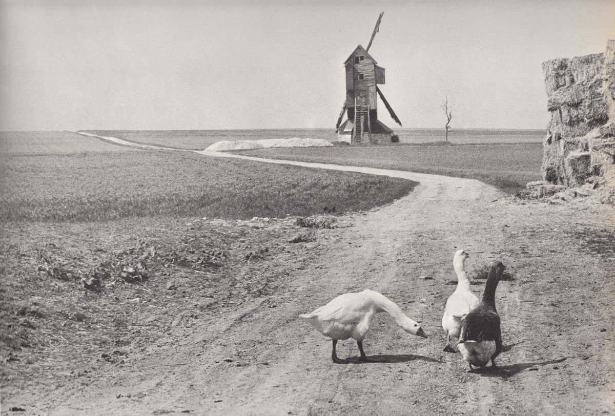 « Moi, je m’occupe presqu’uniquement de l’homme. Je vais au plus pressé. Les paysages ont l’éternité ». Mais même lorsqu’ils sont absents comme ici, ils sont toujours présents : la route qui serpente, les champs nus ou cultivés, le rempart de bottes de paille, le vieux moulin qui se meurt, les oies domestiques qui se dandinent… Tout ici est marqué de l'empreinte de l’homme. Cette image n’est pas nostalgique ; elle nous parle simplement d’un autre monde, essentiellement d’un autre rapport au temps, celui de l’attente du vent qui soufflait dans les ailes ou du pas lent de l’oie. Rien à voir avec l’activisme du « temps réel » qui nous étreint, celui de l’informatique et de nos technologies les plus subtiles.