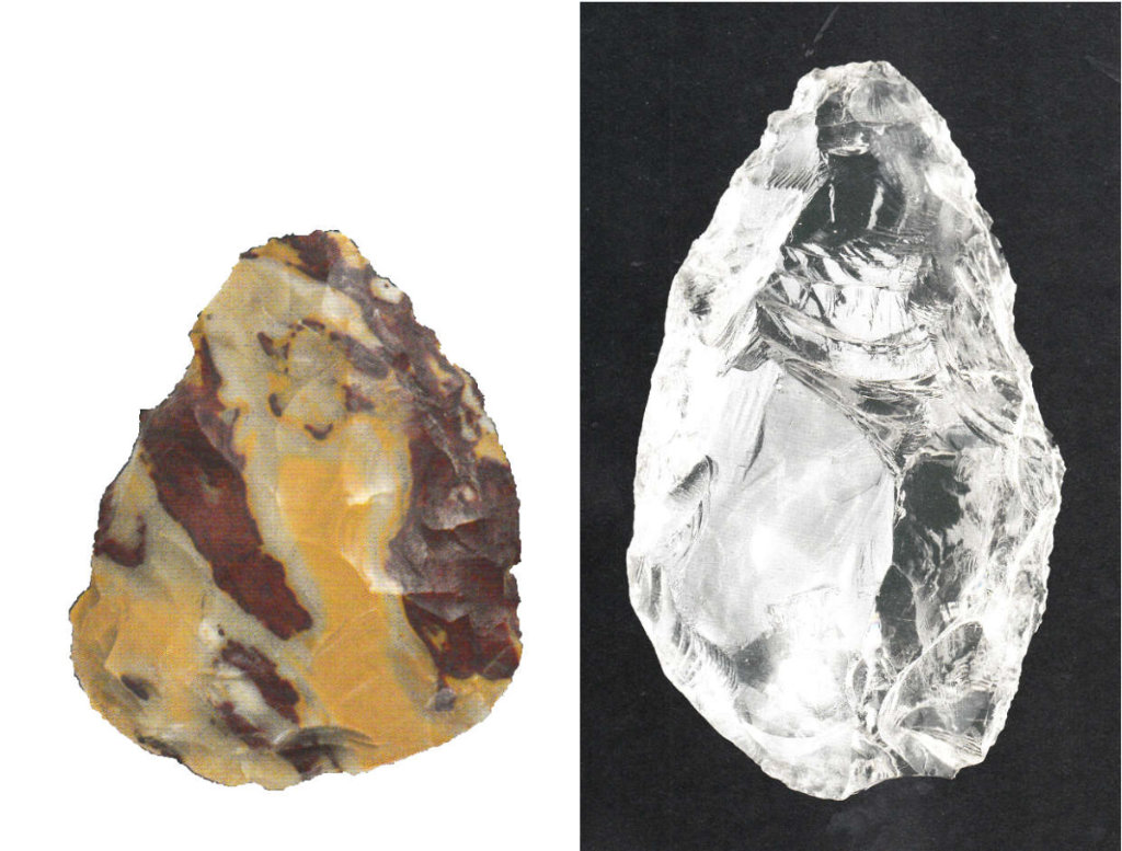 Ce qui surprend dans ces deux racloirs du Moustérien, c’est évidemment les matériaux dans lesquels ils ont été débités. Celui de gauche, trouvé en Corrèze, a été taillé à partir d’un jaspe aux belles nervures mordorées que l’artisan a su habilement mettre en valeur. Celui de droite, découvert en Dordogne, provient d’un cristal de roche dont le tailleur a flatté la transparence. Dans ces deux œuvres, la beauté de la matière est rehaussée par le travail de l’homme ; ce sont de simples outils du quotidien, dont la facture magnifie la seule utilité.