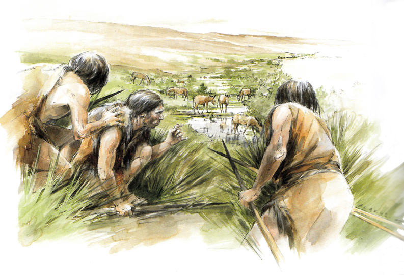On a longtemps cru que les néandertaliens étaient seulement carnivores. On sait maintenant que leur alimentation était beaucoup plus variée : ils consommaient de la viande qu’ils faisaient cuire, mais aussi des fruits, des plantes herbacées, des céréales sauvages ou des poissons d’eau douce. En matière de viande, ils préféraient les herbivores aux carnivores. On les voit ici à l’affût d’un troupeau de chevaux qui viennent s’abreuver dans les méandres d’une rivière. Ils tiennent à la main des lances en bois dont les pointes ont été effilées puis durcies au feu. Le chasseur du milieu esquisse un geste à l’attention de ses compagnons et semble leur parler. On ne sait évidemment rien de leur langue, mais l’hypothèse qu’ils en aient eu une, fondée sur leur anatomie et leurs comportements, a été récemment renforcée par la découverte dans leur patrimoine génétique du même gène qui chez nous est associé au langage. C’est évidemment cette hypothèse qui les rapproche le plus de l’homme moderne car le langage est à la fois le moyen d’une vie sociale sophistiquée et une ressource pour se transmettre des connaissances et des savoir-faire et pour organiser le travail, se le répartir et le réaliser.