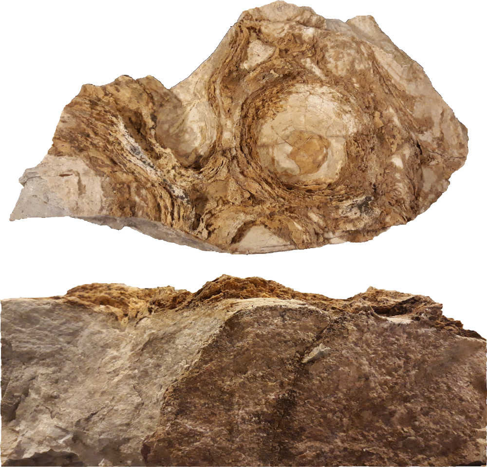 Fossile de stromatolite. Musée d’Alta (Norvège) Vue de haut et de profil. Photographie de l’auteur