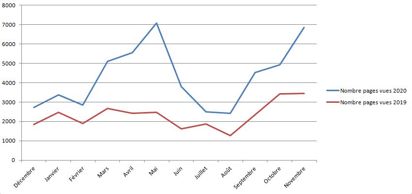Graphique fréquentation PTA 2019 2020Ils correspondent en effet aux deux périodes de confinement vécues en France ; elles ont apparemment été l’occasion d’explorations plus intenses des ressources de la toile numérique.